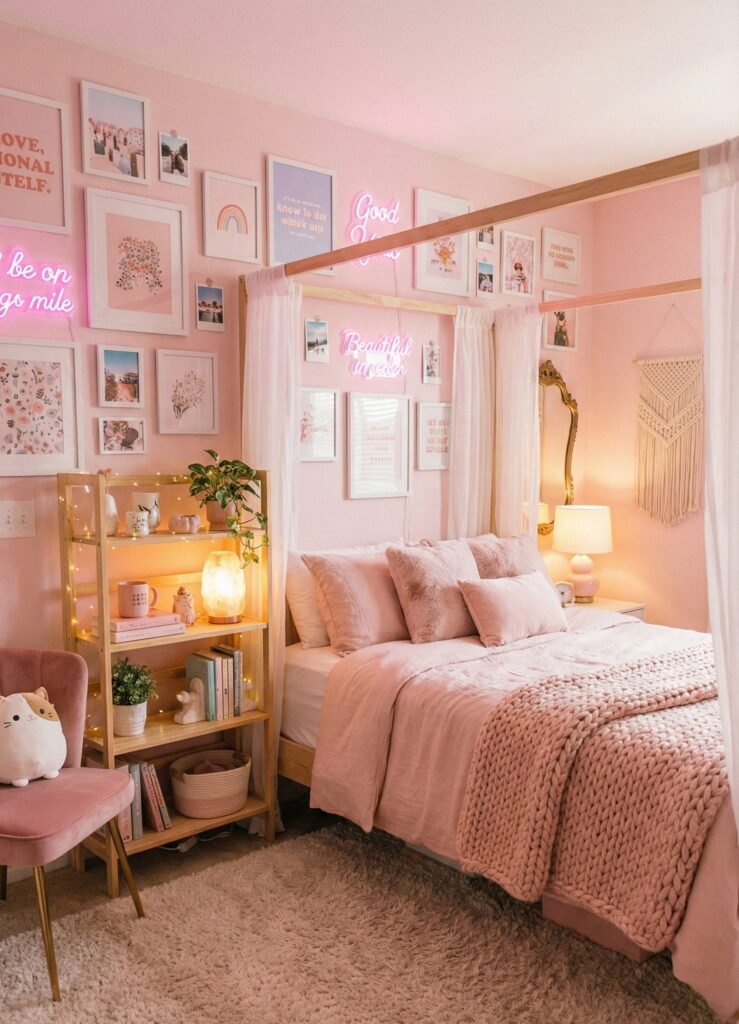 This aesthetic is perfect for girls who love soft, gentle, pastel tones. Soft pink rooms feel relaxing, feminine, and beautiful without being too bold. You can keep it simple by adding pastel bedding, a cute desk setup, and soft wall prints.